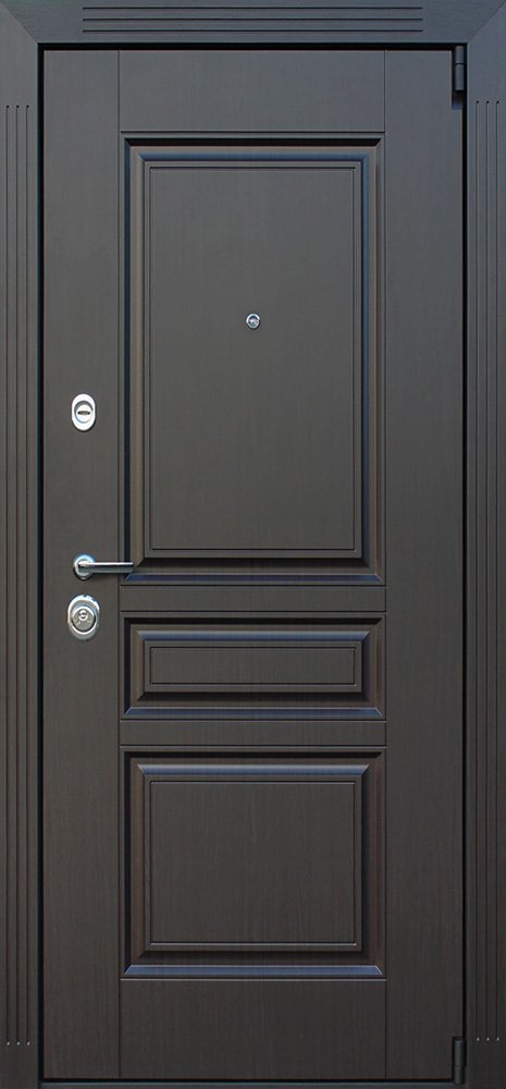 Порошковое покрытие "муар черный". Панель МДФ 16 мм. Объемная фрезеровка. Цвет "венге". Наличник МДФ: толщина 16 мм, ширина 85 мм.